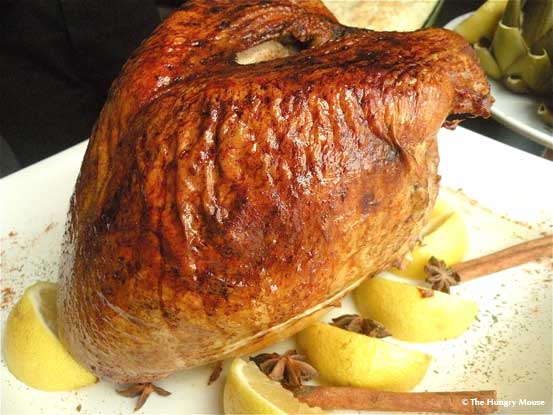 As the bird roasts, you baste it every half hour or so with a mixture of dark soy sauce and whiskey infused with star anise, cinnamon, and garlic.