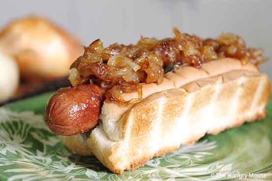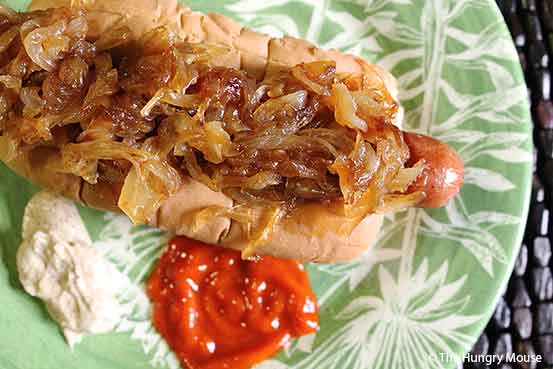 Grilled hot dog. I like Hebrew National. Heaps of caramelized onions.