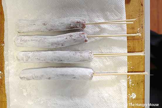 Grab your hot dogs. Pat them dry with paper towels. Whenever you’re deep frying something, you want it to be as dry as can be. (Wet = splatters and coating that doesn’t stick.)
