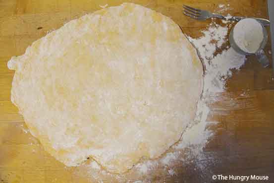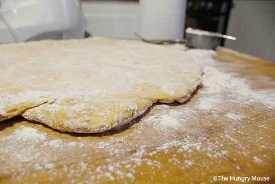 - Round the dough up and turn it out onto a lightly floured board. Toss a little flour on top of the dough and pat it down so that it’s about a 1/4-inch thick.