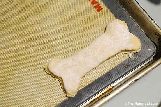- Cut out as many biscuits as you can. I used a combo of my big bone, little bone, kitty, pumpkin, and squirrel. Set the cut biscuits on your prepared pans. They don’t poof up too much, so you can fit a lot on a pan, just keep ’em at least 1/4 inch apart. I did a few of the bigger shapes, and a lot of little bones (perfect single-serving size for our beasts).