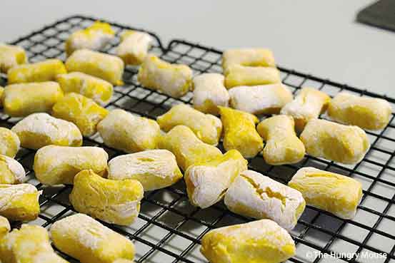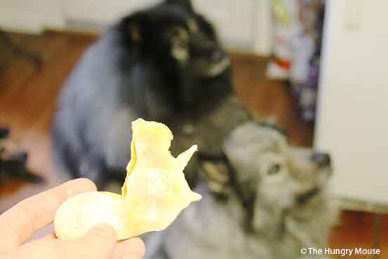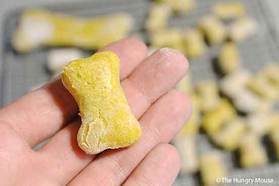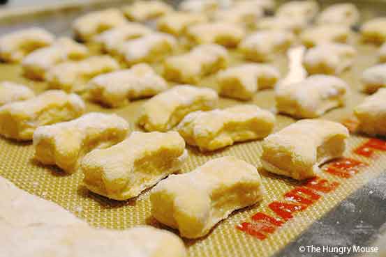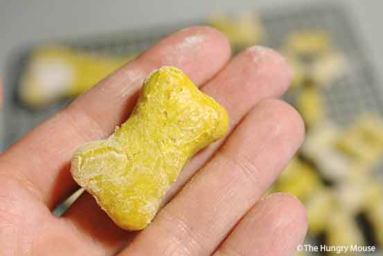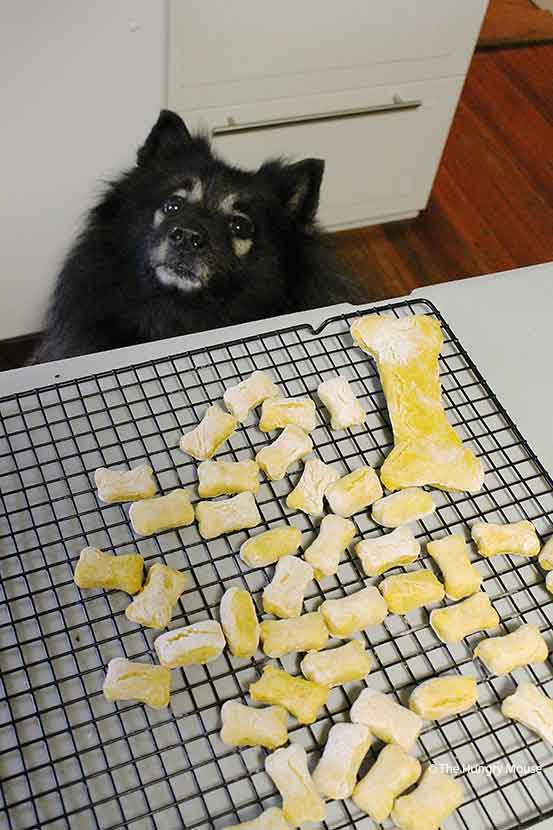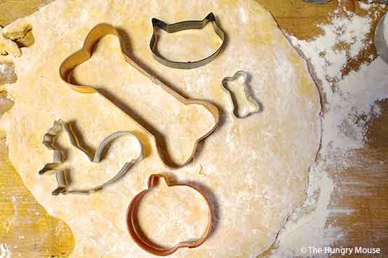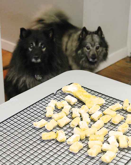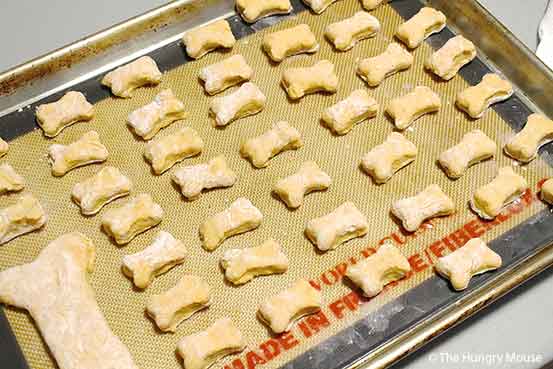 This is my riff on this recipe. I upped the amount of powdered milk, but that’s about it. I cut a bunch of dog-friendly shapes…
