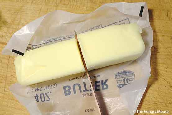 - Chunk up your butter. Toss it in a heavy-bottomed, medium-sized pot. (The heavy bottom will help keep the sugar from scorching.) Melt over medium-high heat.