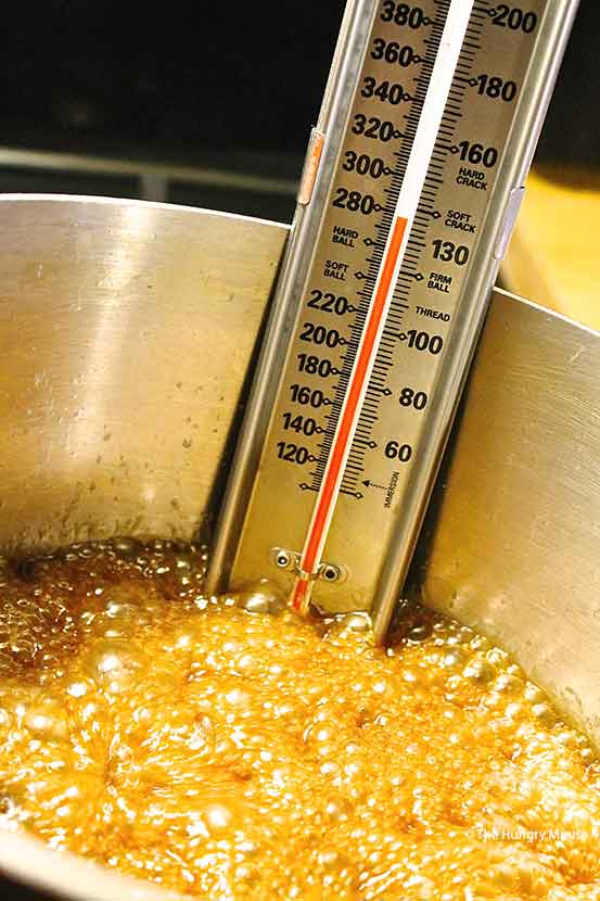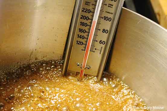 - Clip a candy thermometer inside your pot. Bring the mixture to a boil, without stirring, over medium-high heat. Cook until it reaches 280-degrees F, which will take 5-7 minutes or so.