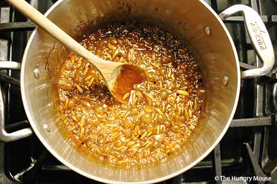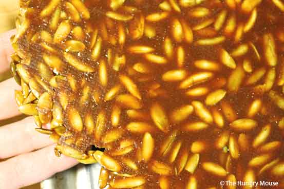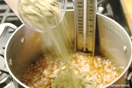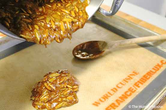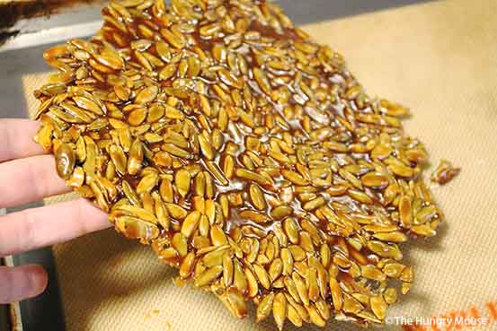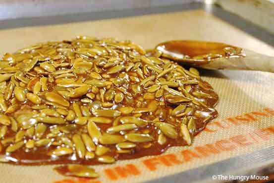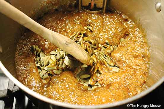 Moving as quickly (and safely, remember, hot sugar is like napalm) as you reasonably can, toss in the toasted pumpkin seeds and stir to thoroughly coat.