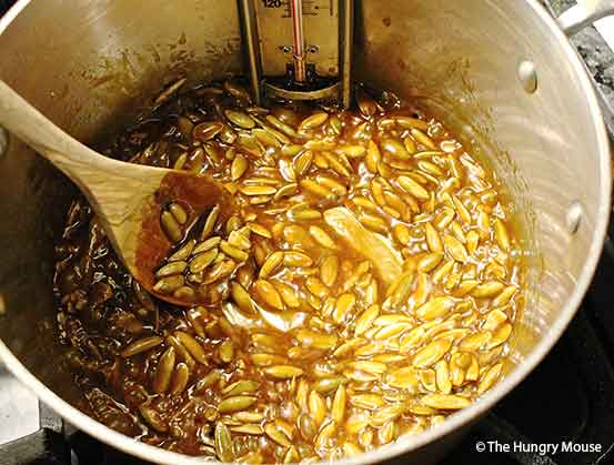 - When your candy hits 280-degrees F, yank it off the heat. Moving as quickly (and safely, remember, hot sugar is like napalm) as you reasonably can, toss in the toasted pumpkin seeds and stir to thoroughly coat.