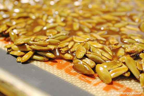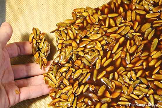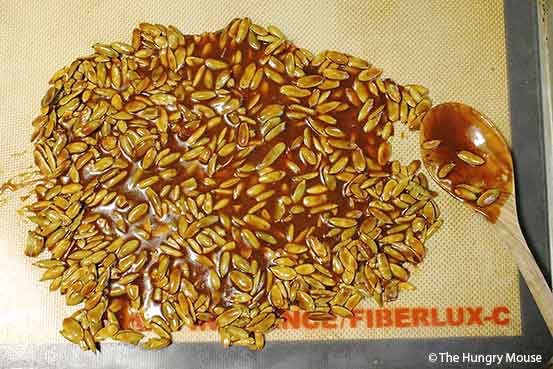 - Toss the pumpkin seeds in an ungreased, nonstick pan. Toast them over medium heat, stirring frequently, until they’re fragrant and lightly browned. Turn them out onto a plate to cool, and set them aside while you make the caramel.