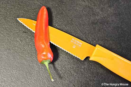 - Slit the chili pepper (go about 3/4 of the way up to the stem) and stick it on the rim of your glass. Make sure to remove any loose seeds from the inside.
