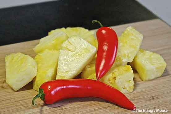 - Following the instructions for your particular machine, juice the pineapple and the chilis, reserving one chili to garnish your glass. I used my Breville Juice Fountain Plus, which is the new love of my life.