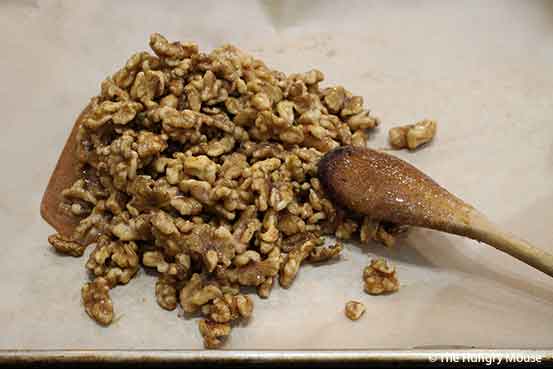 Dump the nuts onto your prepared pan and spread them out with a spoon or spatula.
