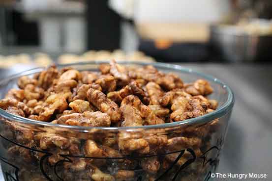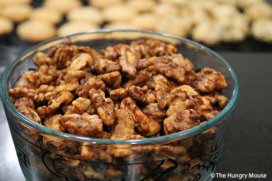 Basically, you coat your nuts in beaten egg whites that you’ve spiked with spices, and roast in the oven until crisp, stirring a couple of times.
