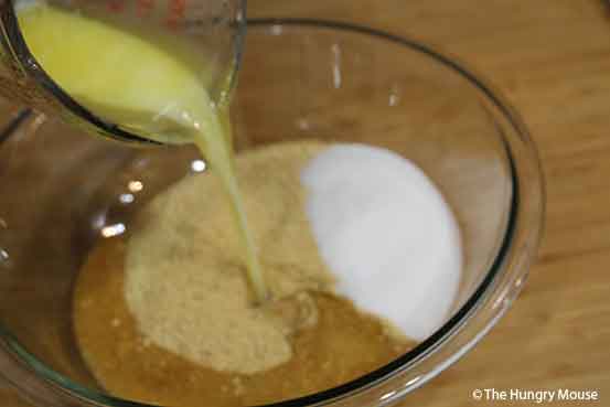 Pour into the bowl with the crumbs and sugar.