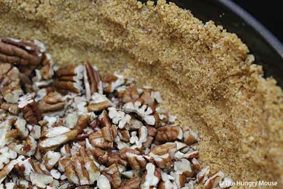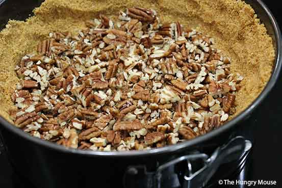 - DUMP THE MIXTURE INTO A NONSTICK, SPRINGFORM PAN. SPREAD THEM OUT, AND PRESS THEM INTO PLACE ON THE BOTTOM AND SIDES OF THE PAN. SPREAD ABOUT 3/4 OF A CUP OF THE TOASTED, CHOPPED PECANS ON THE BOTTOM OF THE CRUST, RESERVING THE REST FOR GARNISHING THE FINISHED PIE.