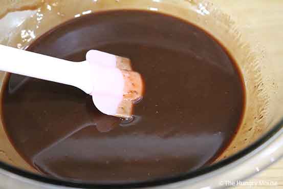 Melt the butter and chocolate chips together in the microwave or on the stove in a medium, heavy-bottomed pot over low heat (stirring frequently).