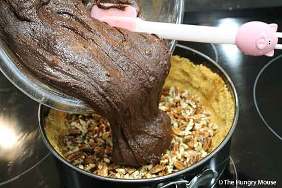 The batter will be really thick, like brownie batter. Pour the batter into your prepared pie shell, right on top of those pecans.