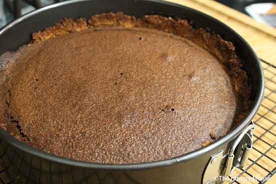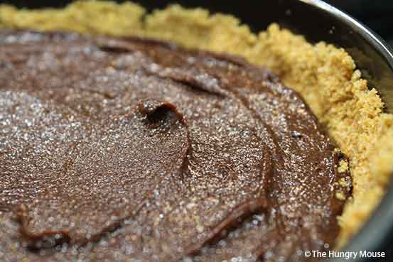 A graham cracker crust sprinkled with chopped, toasted pecans, then filled with luscious, dense chocolate cake that’s *almost* flourless.