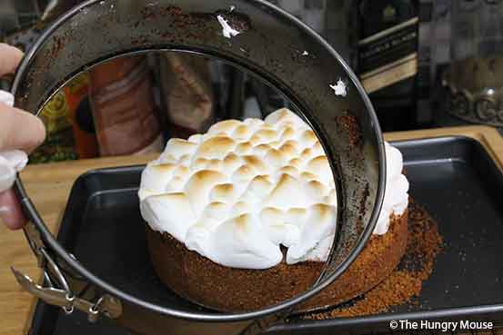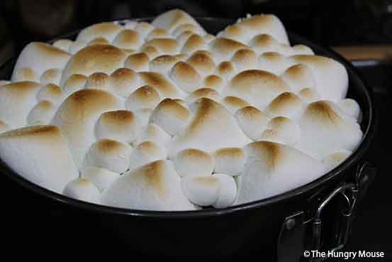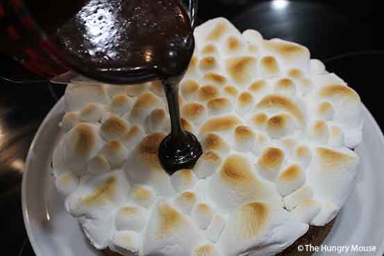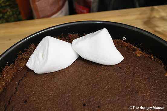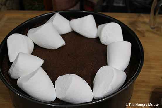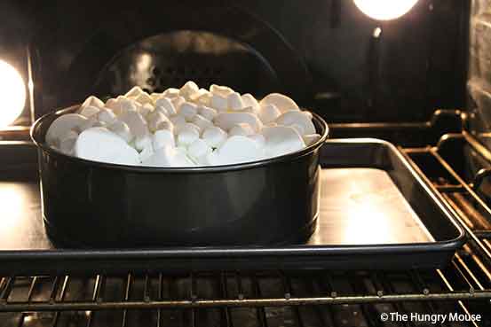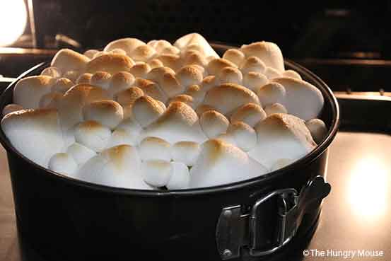 - SET THE PAN ON A SHEET PAN (TO CATCH ANY OVERFLOW, JUST IN CASE). SET THE PAN ON THE LOWEST RACK IN YOUR OVEN. BROIL FOR ABOUT A MINUTE, UNTIL THE MARSHMALLOWS ARE NICELY BROWNED ON TOP. YANK THE PAN OUT OF THE OVEN. SET ON A WIRE RACK. IMMEDIATELY REMOVE THE OUTER RING ON THE SPRINGFORM PAN. LET COOL FOR AT LEAST 10 MINUTES, ABOUT THE TIME IT TAKES TO MAKE THE CHOCOLATE SAUCE.