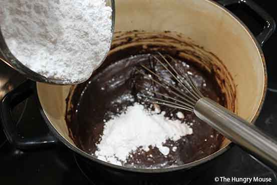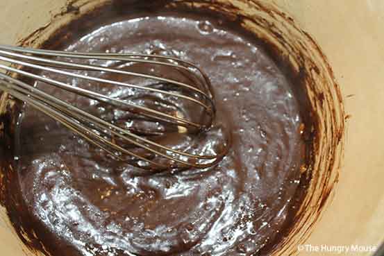 Add the flour, unsweetened cocoa, eggs, vanilla extract, and salt. Mix until well combined and uniform.