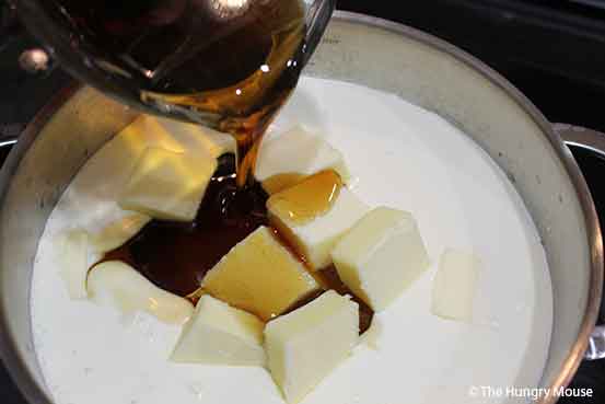 - Put the heavy cream, light corn syrup, sugar, butter, and maple syrup in a large, heavy-bottomed pot.