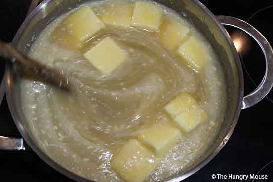 - Set it on the stove over high heat. Stir well to start to dissolve the sugar and melt the butter. Stir frequently until the mixture comes to a boil.