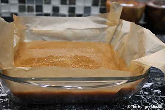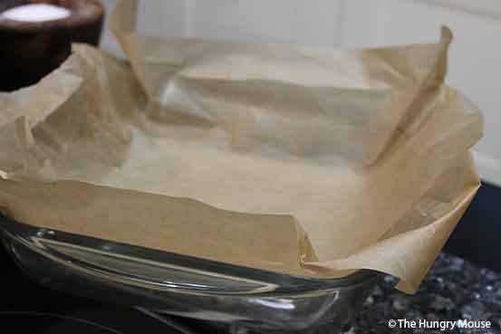 - Line an 8-inch x 8-inch heatproof baking dish with parchment paper, enough so that the edges of the paper hang over the sides of the pan.