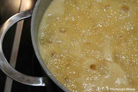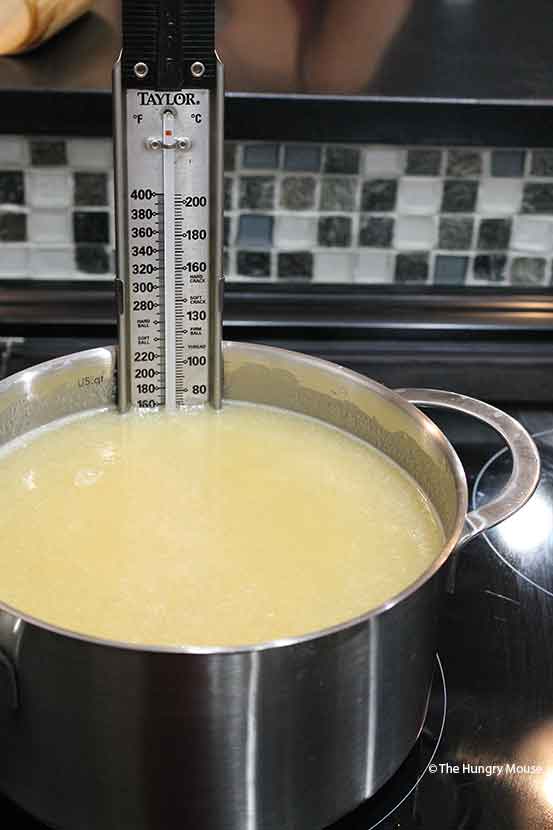Once it starts to bubble, knock the heat down to medium-high, and clip your candy thermometer to the inside of the pot.