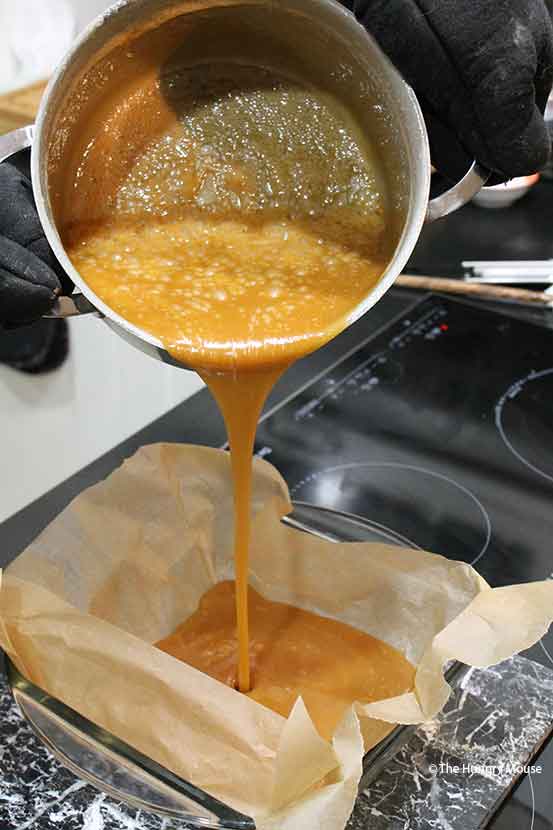 - Pour the spiced caramel out into your prepared pan. Be really, really careful.