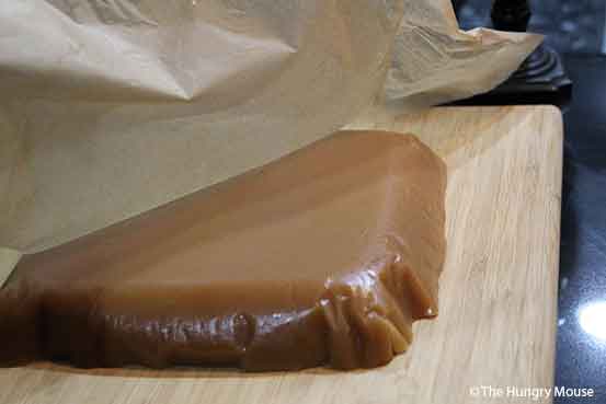 - With a sharp, non-serrated knife, slice the caramel into cubes or rectangles.