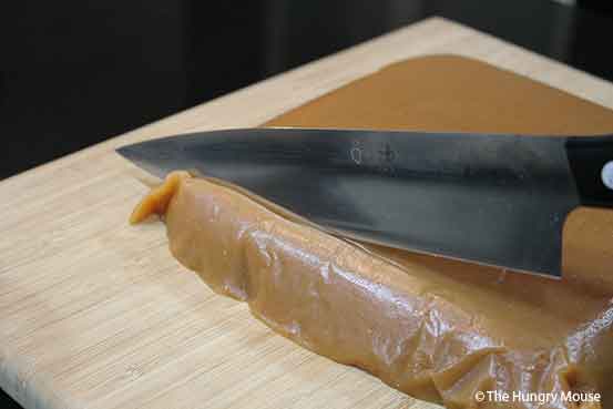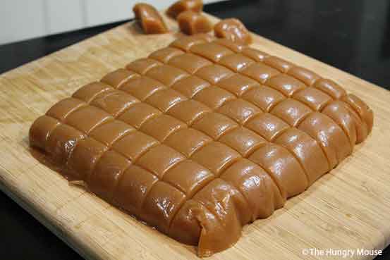 With a sharp, non-serrated knife, slice the caramel into cubes or rectangles.