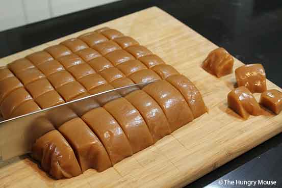 With a sharp, non-serrated knife, slice the caramel into cubes or rectangles.