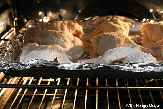 Line two sheet pans with foil. Spray lightly with oil, or grease with butter. Set aside while you prep the chicken.