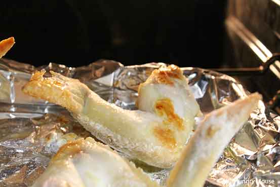 - After the second 20 minutes, they should be golden brown and crispy. Yank the pan out of the oven and set on a rack for a minute while you whip up the sauce.