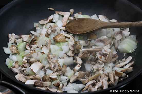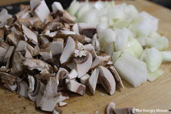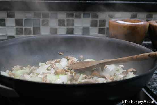 When the oil is hot (it’ll shimmer), toss in the chopped mushrooms and onion.