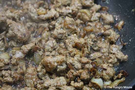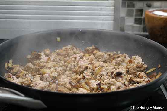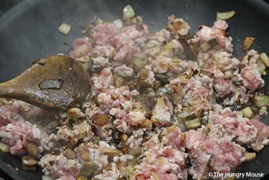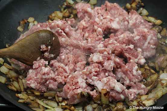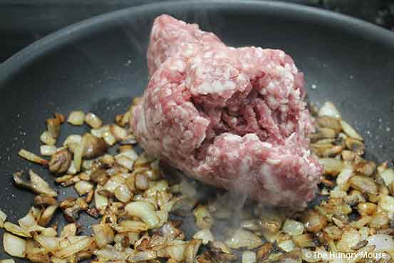 Once you chop everything up, caramelize the onions and mushrooms, then toss in the ground pork and cook til browned.