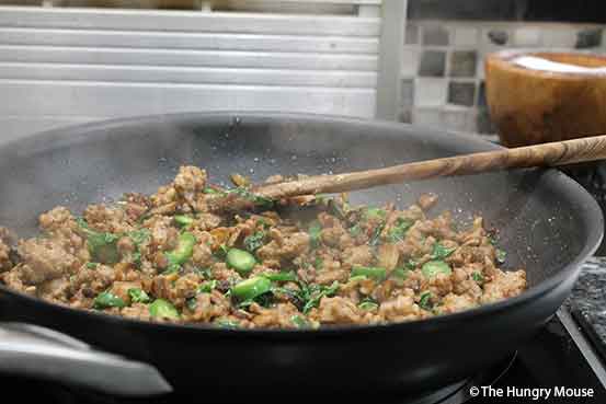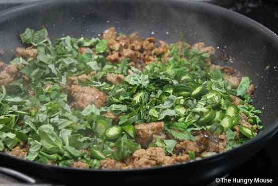 - When your pork is just about cooked through, it’s time to finish the dish. Toss in your basil, sliced chilis, and garlic.