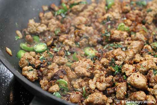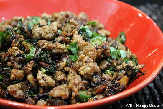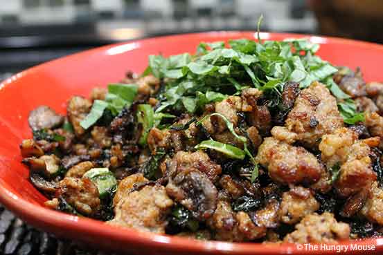 Keep the heat on high, and break the ground pork up, stirring as you go to incorporate the mushrooms and onions.