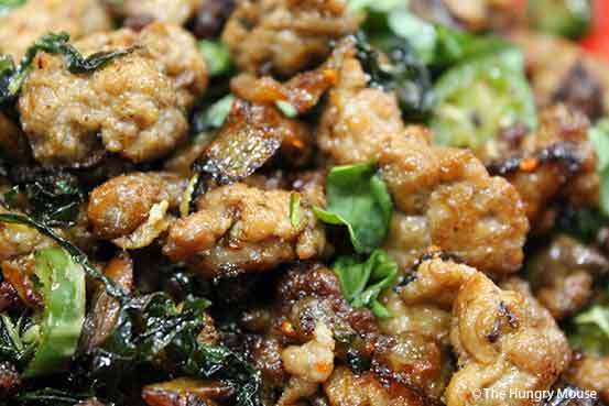 - When your mushrooms and onion are nicely browned, toss your ground pork right on top.