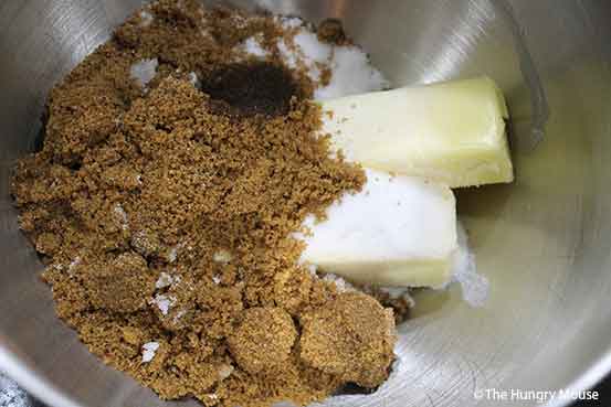 In the bowl of your stand mixer (or in a large mixing bowl if you’re mixing by hand), put the softened butter, brown sugar, white sugar, and vanilla.