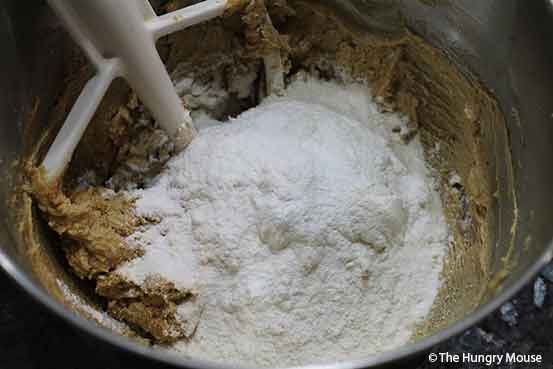 Toss this dry mixture into the butter mixture. Beat until just well combined. (Go slowly at first, to avoid raising a cloud of flour.)