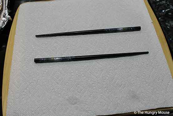Grab 2 chopsticks, set them down on your cutting board like this.