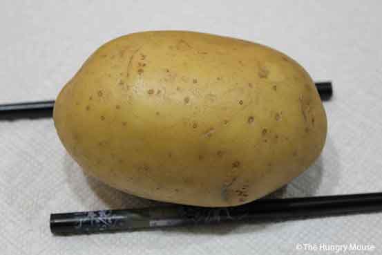 Snuggle your potato in between and adjust them so the potato is held in place by the fat ends of the chopsticks.