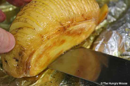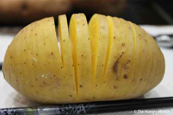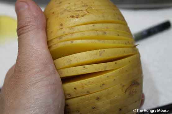 - Cut thin slices into each whole potato, cutting almost all the way through, but not quite. (So your potato fans out nicely.)
