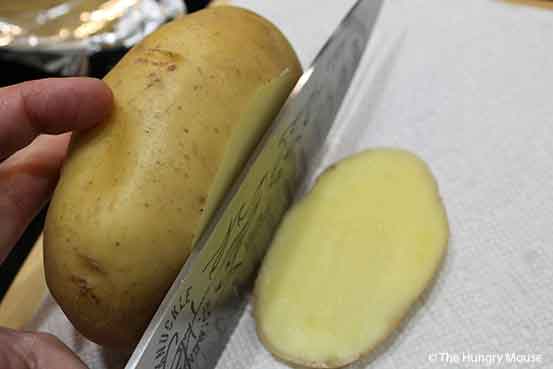 Here’s a quick, practically foolproof way to slice the potatoes.