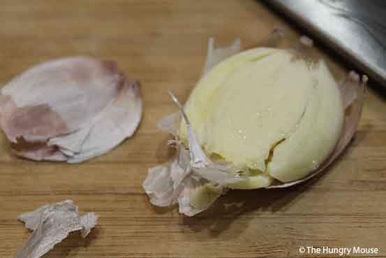 Smash a clove of garlic with the flat side of a big knife. Remove and discard the skin.