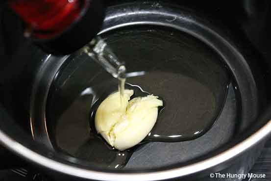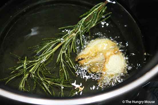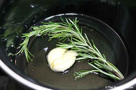 Leave the garlic and rosemary in the oil to infuse. (You don’t want them to scorch, etc.)