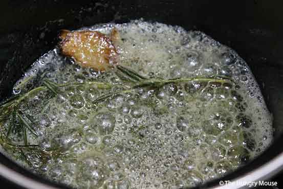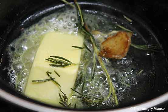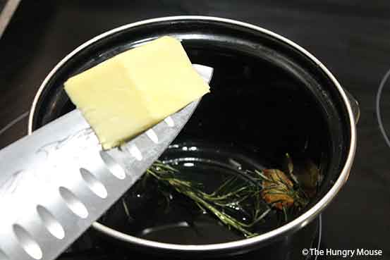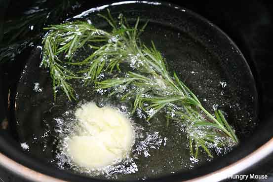 - Make the infused butter: Grab the pot that you infused the oil in. Keep the rosemary and garlic clove in it. Add the butter to the pot. Set it back on the stove. Cook over medium heat until the butter is melted and just starts to foam.