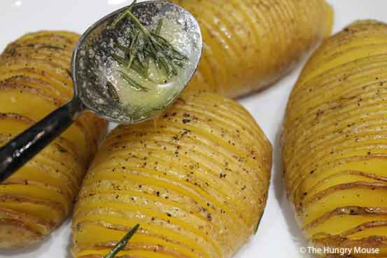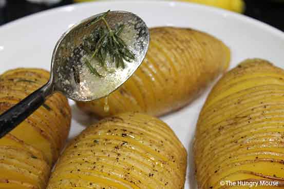 - Drizzle each potato with a spoonful or two of the fragrant, infused oil. As you can, get the oil in between the slices. Keep the pot with the rosemary and garlic in it off to the side. You’re going to use them to make an infused butter to finish the potatoes.