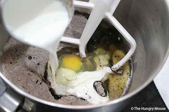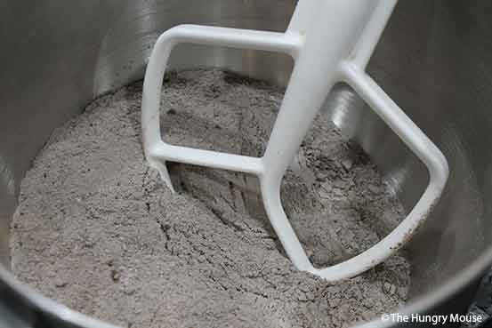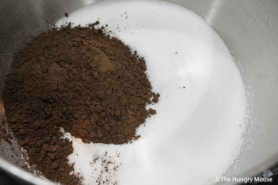 Put the flour, baking soda, salt, cocoa, and sugar in the bowl of your mixer (or a large mixing bowl, if you’re using a handheld electric mixer).