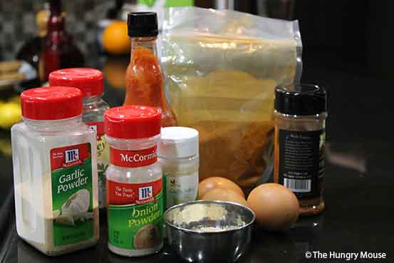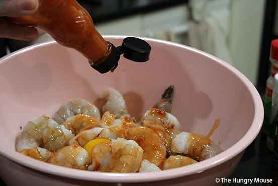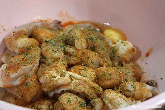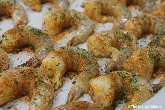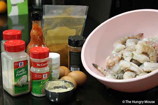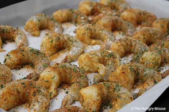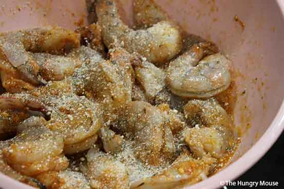 - Season the shrimp: Put the shrimp in a large bowl. Add 2 whole egg plus one extra egg white. Add the olive oil, hot sauce, 1 Tablespoon garlic powder, 1 teaspoon garlic salt, 1 teaspoon onion powder, 2 Tablespoons dried parsley, 1 1/2 Tablespoons cajun spice, and 1/3 cup grated Parmesan. Mix well to coat the shrimp evenly.