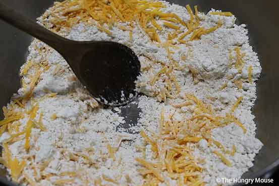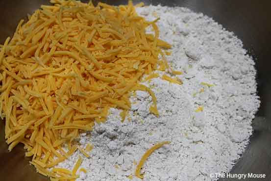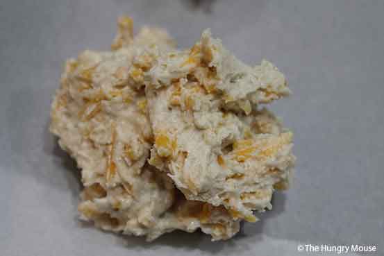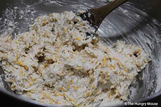 - Make the dough: In a large mixing bowl, put the Bisquick, garlic powder, and shredded cheese. Mix until uniform, making sure to break up any clumps of Bisquick. Add the milk. Mix until uniform.